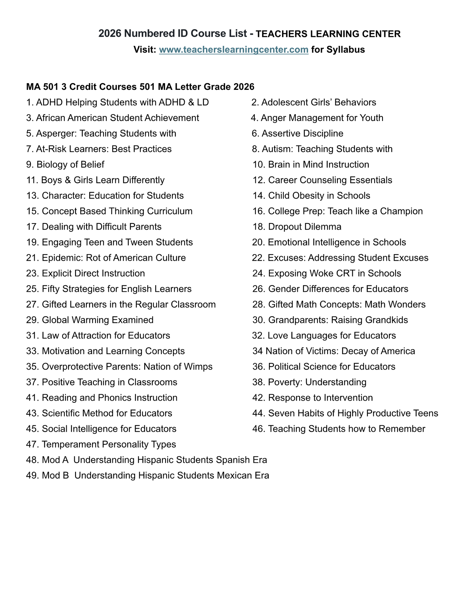 Handouts How TLC Courses Work 2026 All Course Titles Courses E-Flyer 3 Credit Courses 1. ADHD Helping Adolescents 2026 TLC CSUP 3 credits Order Course 2. Adolescent Girls 2026 TLC CSUP 3 credits Order Course 3. African American Student Achievement 2026 TLC CSUP 3 credits Order Course 4. Anger Management for Youth 2026 TLC CSUP 3 credits Order Course 5. Asbergers Teaching Students with Asbergers 2026 TLC CSUP 3 credits Order Course 6. Assertive Discipline 2026 TLC CSUP 3 credits Order Course 7. At-Risk Best Practices 2026 TLC CSUP 3 credits Order Course 8. Autism Teaching Students with Autism 2026 TLC CSUP 3 credits Order Course 9. Biology of Beleif 2026 TLC CSUP 3 credits Order Course 10. Brain in Mind Teaching 2026 TLC CSUP Order Course 11. Boys and Girls Learn Differntly 2026 TLC CSUP Order Course 12. Career Counseling 2026 TLC CSUP 3 credits Order Course 13. Character Education in Schools 2026 TLC CSUP 3 credits Order Course 14. Child Obesity 2026 TLC CSUP 3 credits Order Course 15. Concept Based Thinking Curriculum 2026 TLC CSUP 3 credits Order Course 16. College prep Champion 2026 TLC CSUP 3 credits Order Course 17. Dealing with Difficult Parents 2026 TLC CSUP 3 credits Order Course 18. Dropout Dilemma Syllabus 2026 TLC CSUP Order Course 19. Engaging Tweens Teens 2026 TLC CSUP 3 credits Order Course 20 Emotional Intelligences 2026 TLC CSUP 3 credits Order Course 21. Epidemic Rot US Culture 2026 TLC CSUP 3 credits Order Course 22 Excuses Addressed 2026 TLC CSUP 3 credits Order Course PE and Technology – #23 Order Course 24. Exposing CRT Woke in Schools 2026 TLC CSUP 3 credits Order Course 25. Fifty Stratagies ELLA 2026 TLC CSUP 3 credits Order Course 26. Gender Differences for Educators 2026 TLC CSUP 3 credits Order Course 27. Gifted Learners in Regular Classrooms 2026 TLC CSUP 3 credits Order Course 28. Gifted Math Concepts 2026 TLC CSUP 3 credits Order Course 29. Global Warming Examined 2026 TLC CSUP 3 credits Order Course 30. Grandparents Raising Grandchildren 2026 TLC CSUP 3 credits Order Course 31.Ā Law of Attraction for Educators 2026 TLC CSUP 3 credits Order Course 32. Love Languages 2026 TLC CSUP 3 credits Order Course 33. Motivation Learning 2026 TLC CSUP 3 credits Order Course 34 Nation of Victims 2026 TLC CSUP 3 credits Order Course 35. Over Protective Parents 2026 TLC CSUP 3 credits Order Course 36. Political Science for Educators 2026 lCSUP TLC Order Course 37. Positive Teaching 2026 TLC CSUP 3 credits Order Course 38. Understanding Poverty 2026 TLC CSUP 3 credits Order Course 39. Math Struggling Students 2026 TLC CSUP 3 credits Order Course 41. Reading Phonics CSUP Final 3 credits TLC Order Course 42. Response to Intervention RTI 2026 TLC CSUP 3 credits Order Course 43. Scientific Method Revisited 2026 TLC CSUP 3 credits Order Course 44. Seven Habits of Heighly Effective Teens 2026 TLC CSUP 3 credits Order Course 45. Social Inteligence for Educators Order Course 46. Teaching Students how to Remember 2026 TLC CSUP 3 credits Order Course 47. Temperament Personality Types 2026 TLC CSUP 3 credits Order Course 48. Hispanic Students Mod A 2026 TLC CSUP 3 credits Order Course 49. Hispanic Students Mod B 2026 TLC CSUP 3 credits Order Course 1 Credit Courses 53. 1 credit Bully Harrasement 2026 TLC CSUP Order Course 54. 1 credit Character Personality Types 2026 TLC CSUP 1 credi2 Order Course 55. 1 credit Differentiated Instruction 2026 TLC CSUP 1 credit Order Course 56. 1 credit Educating Oppositional Children 2026 TLC CSUP 1 Order Course 57. 1 credit Elementary K-6 Personalities Enneagram 2026 TLC CSUP 1 credit Order Course 58. 1 credit How Students Learn 2026 TLC CSUP 1 credit Order Course 2 Credit Courses 50. 2 credits Art Science of Teaching 2026 TLC CSUP Order Course 51. 2 credits Multiple Intelligences 2026 TLC CSUP Order Course 52. 2 credits Resilience Revollution 2026 TLC CSUP Order Course Technology 500 Courses 59. Building-Your-Google-Classroom Order Course 60. Designing-an-Online-Classroom Order Course 61. Distance Learning_ From Construction to Instruction Order Course 62. AI Artificial Intelligence Leveraging for Education Order Course 63. Teaching-with-Tablets Order Course 64. iPads-in-the-Classsroom-CSUP Order Course 65. Smartphones in the Classroom Order Course 66. Teaching Online blended Environments Order Course 67 Tomorrows-Technology-in-Todays-Classroom Order Course 68. Universal-Design-for-Learning Order Course 69. Video Game Concepts in Classrooms Gamification Order Course 70. Providing Effective Feedback Order Course 71. 501-Getting_Googled Order Course 72. Strategies for Reaching At-Risk Students in the High School Setting Order Course 73. PE Physical Education and Technology Order Course 74 – Strategies for Reaching At-Risk Students in the Elementary SettingĀ Order Course 75. Grant writting made Easy Order Course 76. Building-Classroom-Culture-Syllabus Order Course